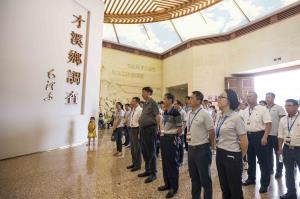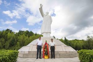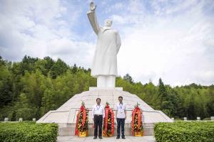 毛主席纪念园内,大家沿着151级台阶拾级而上,庄重地走到毛主席雕像前,整齐驻足,向毛主席雕像敬献花篮,三次鞠躬,并缓步绕行雕像一周,深情缅怀老一辈革命家的丰功伟绩。